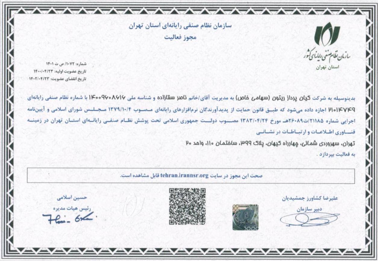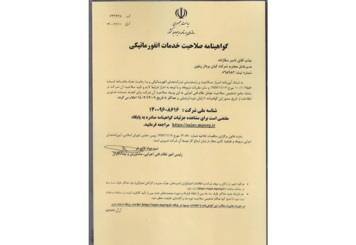 کیان پرداز ریتونگواهینامههاجهت مشاهده هر گواهینامه، روی آن کلیک کنید. جهت مشاهده و اعتبار سنجی گواهی در سایت صادر کننده، کلیک کنید جهت مشاهده و اعتبار سنجی گواهی در سایت صادر کننده، کلیک کنید جهت مشاهده و اعتبار سنجی گواهی در سایت صادر کننده، کلیک کنید